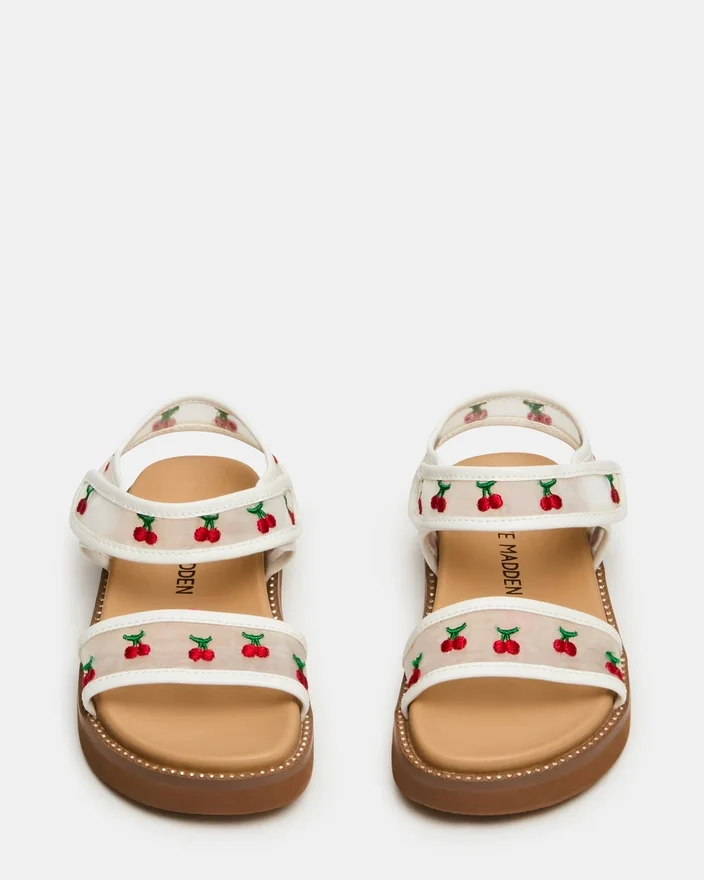 Introducing the Toddlers’ Lyla White—a Playful Footbed Sandal Designed for Little Explorers. Featuring Charming Embroidered Cherry Details and Breathable Mesh Construction, This Sandal Keeps Tiny Feet Comfortable All Day Long. The Adjustable Velcro Straps Ensure a Secure, Customizable Fit That Grows with Your Child. Perfect for Warm Weather Adventures, from Park Days to Casual Outings.