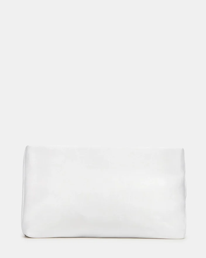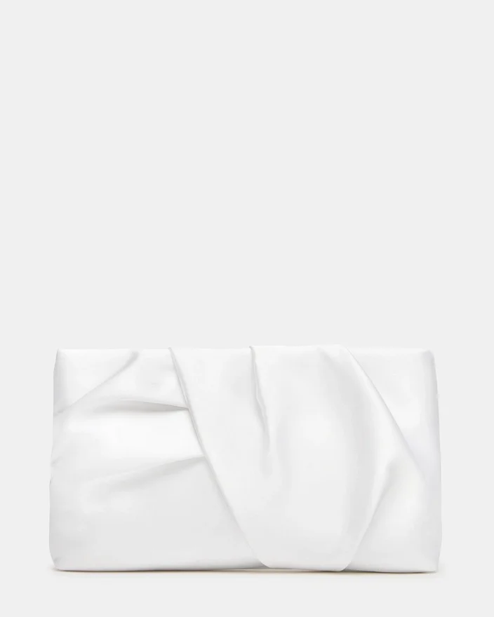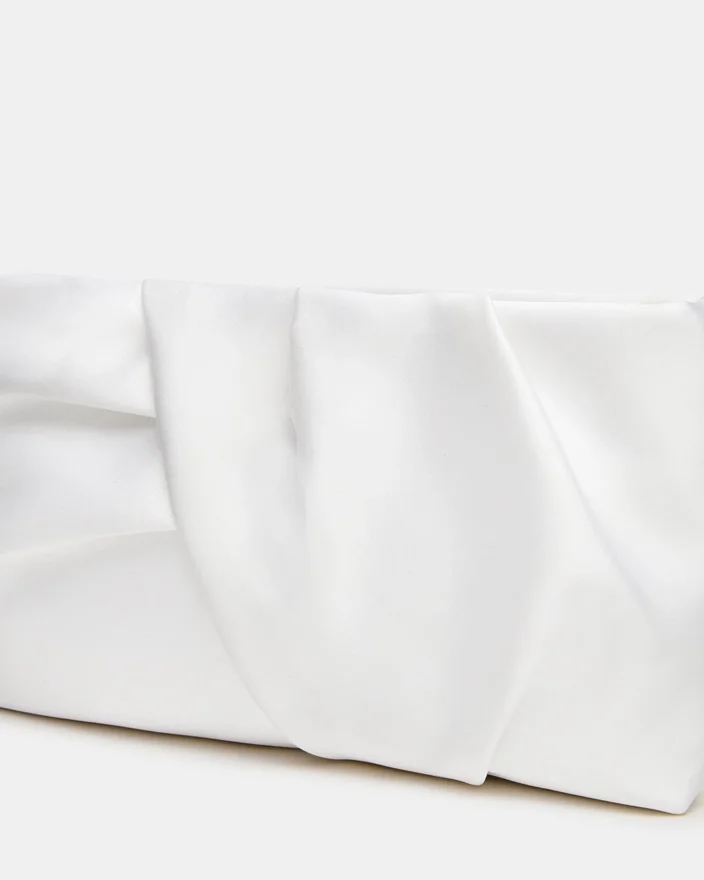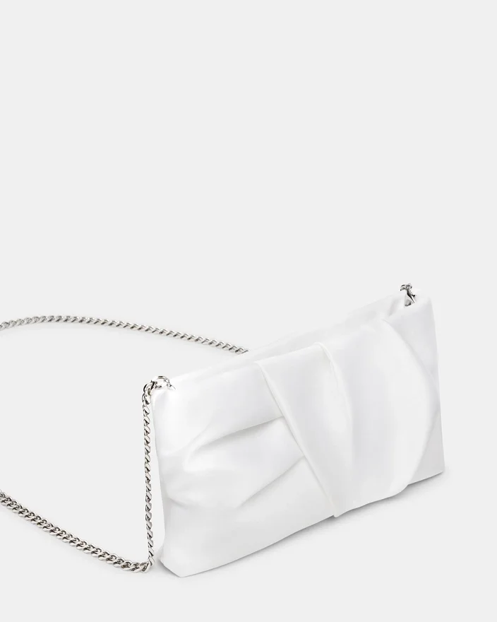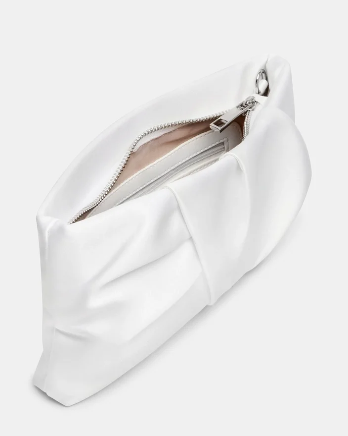The Lilia Bag White Showcases Refined Craftsmanship with Its Elongated Silhouette and Intricate Hand-Pleated Detailing. Crafted from Sumptuous Satin Fabric, This Clutch Delivers a Luxurious Tactile Experience with Its Soft, Fluid Drape. The Top Metal Zip Closure Ensures Secure Storage, While Thoughtful Inner Organization Keeps Essentials Accessible. The Removable Chain Crossbody Strap Offers Versatile Styling—Carry It as a Clutch for Evening Events or Wear It Crossbody for Hands-Free Convenience. A Sophisticated Accessory That Transitions Effortlessly from Day to Night.
