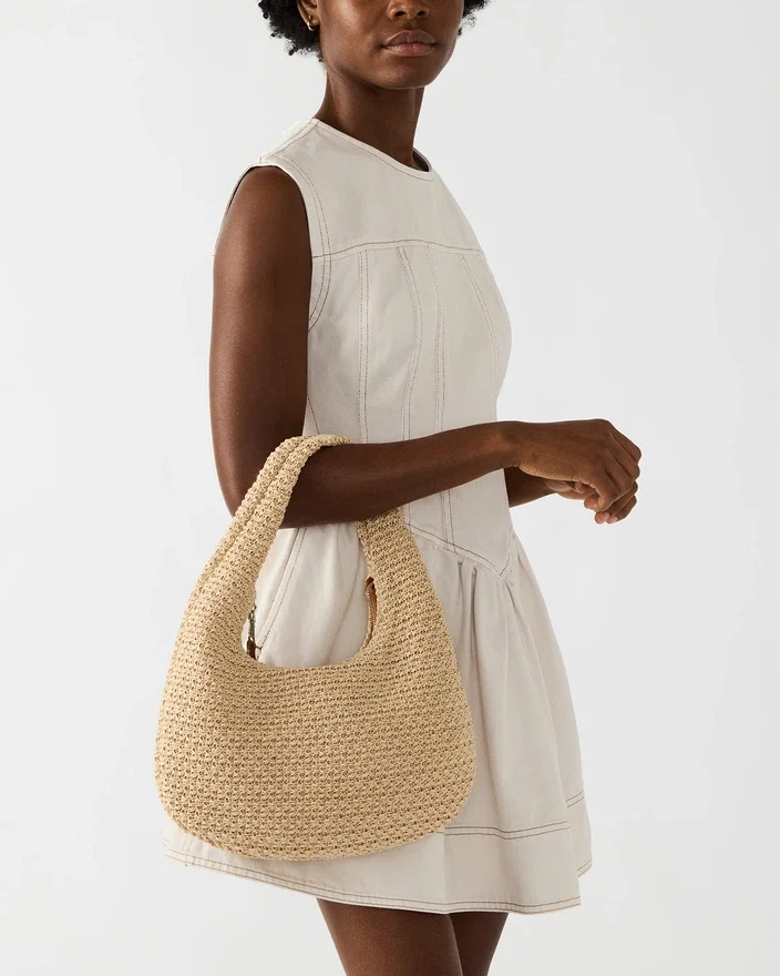 Experience Breezy Fashion with the Daena Bag Natural. Made from Natural Straw, This Crescent-Shaped Handbag Features a Convenient Top-Zipper Closure and is Adorned with a Knotted Printed Square Scarf. Stay Stylish and Organized While on the Go!