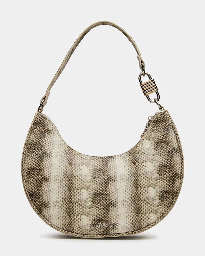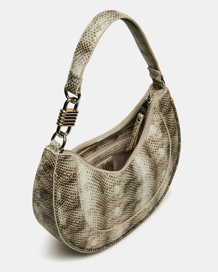 The Lohan Bag Bone/Multi Bag is a Structured Crescent Hobo Shoulder Bag That Features a Distinctive Statement Hardware Piece, Elevating Its Stylish Appeal. Designed for Both Function and Fashion, It Includes Two Front Zip Compartments and an Interior Back Wall Pocket, Offering Organized Storage for Essentials. Its Shape and Sturdy Construction Ensure It Maintains Form While Providing Comfortable Shoulder Carry, Making It a Versatile Accessory for Refined Everyday Wear.