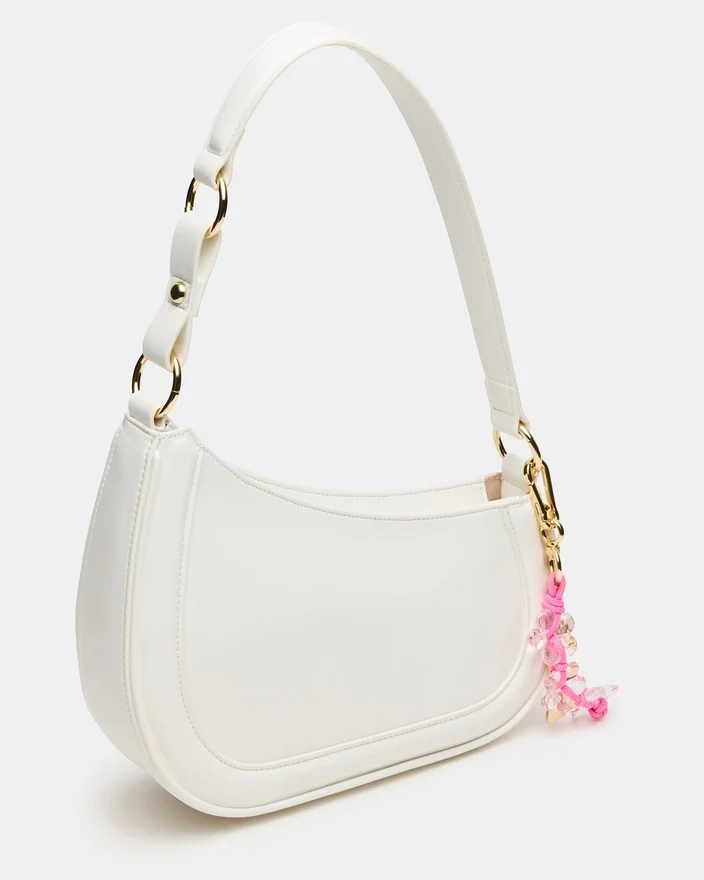 This Musee Bag White is an Asymmetrical Shoulder Bag That Features a Top-Zipper Closure, Making It Both Secure and Stylish. The Flower Bead Bag Charm Adds a Touch of Whimsy. With Its Unique Design and Functional Features, This Bag is an Ideal Accessory for Any Fashion-Forward Individual.