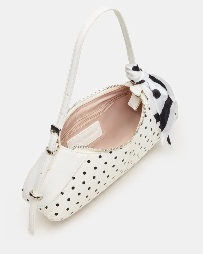 The Roxey Bag Dots Combines Sophisticated Design with Practical Functionality. This Crescent-Shaped Shoulder Bag Features a Secure Top-Zipper Closure and Arrives with an Attachable Knotted Scarf for Versatile Styling Options. Interior Organization is Enhanced with Dedicated Pouch Compartments on Both the Back and Front Walls, Ensuring Your Essentials Stay Organized and Accessible. The Polished Silhouette Makes It an Effortless Addition to Any Wardrobe, Transitioning Seamlessly from Day to Evening Wear.