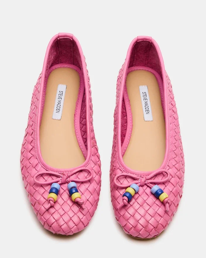 The Divy Pink Leather Ballet Flat Showcases Refined Craftsmanship with Its Woven Construction and Graceful Bow Embellishment. This Round-Toe Design Balances Minimalist Aesthetics with Functional Elegance, Making It an Ideal Choice for Those Seeking a Versatile Flat That Transitions Effortlessly Across Occasions. The Textured Woven Detailing Adds Visual Interest While Maintaining the Understated Sophistication Ballet Flats Are Known For.