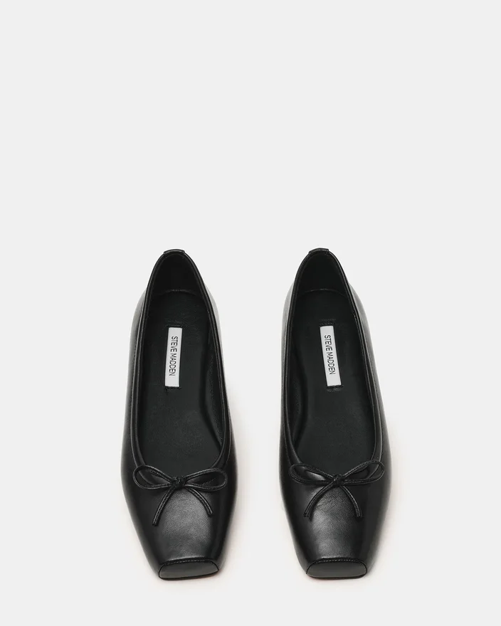 The Eleve Black Leather Refined Ballet Flat Elevates Everyday Elegance. The Square-Toe Silhouette Offers a Contemporary Edge While Maintaining the Timeless Appeal of a Classic Flat. Finished with a Delicate Bow Detail at the Vamp, This Style Balances Sophistication with Understated Charm. Perfect for Transitioning Seamlessly from Office to Evening, This Versatile Flat Delivers Comfort Without Compromising on Polish.