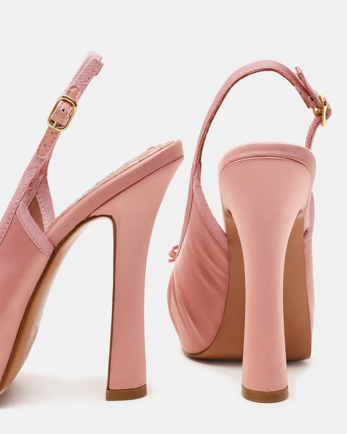 Elevate Your Look with Sofie Blush Satin Slingback, a Sophisticated Ballet Heel Adorned with a Bow. The Structured Platform Foundation Provides Stability and Comfort, While the Refined Heel Adds Instant Polish to Any Ensemble. This Style Seamlessly Transitions from Day to Evening, Offering the Perfect Balance of Elegance and Wearability.