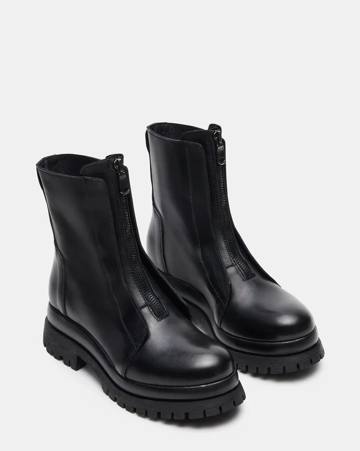 The Milton Black Leather Ankle Boot Delivers a Sleek Moto-Inspired Design with Durable Leather Construction. This Bootie Combines Rugged Aesthetics with Refined Craftsmanship, Offering Both Style and Lasting Comfort. Its Sturdy Sole Ensures Reliable Traction, Making It an Ideal Choice for Those Seeking an Edgy Yet Practical Footwear Option.