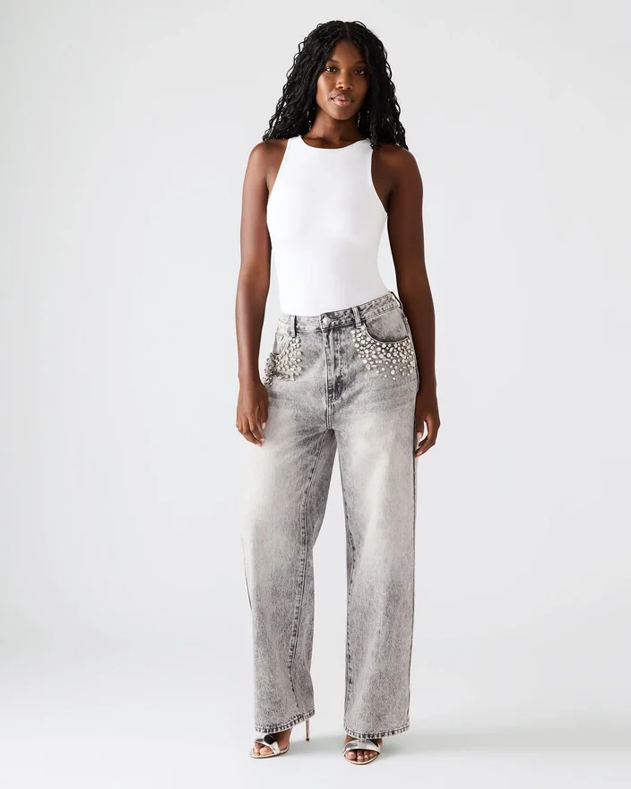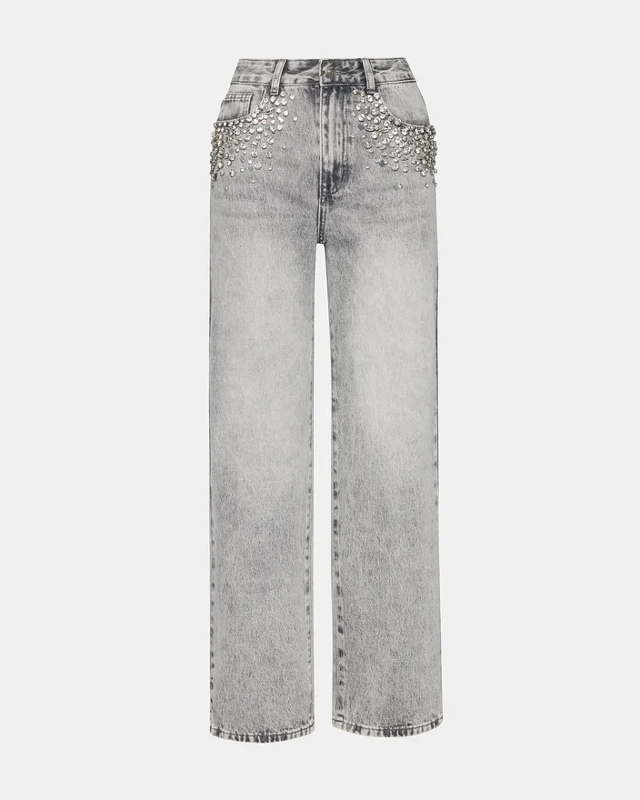 The Eras Jean Features a Sophisticated Straight-Leg Silhouette Enhanced with Delicate Rhinestone Embellishments for Subtle Sparkle. Designed with Two Functional Front Pockets and Back Pockets, These Denim Jeans Combine Style with Practical Convenience, Making Them a Refined Choice for Everyday Wear or Special Occasions. Crafted to Deliver Both Comfort and Elegance, They Elevate Your Denim Collection with Expert Attention to Detail.