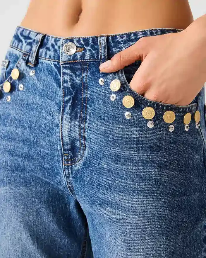 The Irys Jean Dark Navy Delivers Timeless Silhouette with Contemporary Edge. These High-Rise Flares Feature a Flattering Cut That Elongates the Leg While Maintaining a Refined Aesthetic. Functional Front and Back Pockets Provide Practical Storage, While Signature Gold Detail Buttons Elevate the Overall Design with a Touch of Luxury. A Versatile Staple That Transitions Seamlessly from Day to Evening Wear.