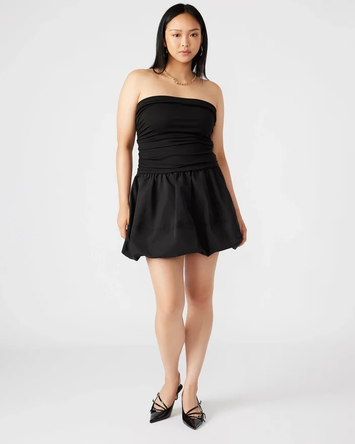 This Amari Mini Dress Features a Stretch Knit Top and a Bubble-Hem Skirt for Both Comfort and Style. The Side Zip and Elastic Provide a Secure Fit, While the Fully Lined, Strapless Design and Ruched Side Seam Bodice Add a Touch of Elegance. Perfect for Any Occasion with Its Slightly Dropped Waist.
