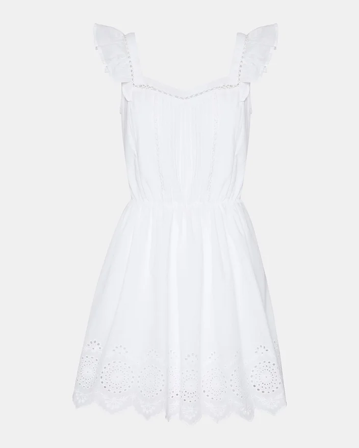 Elevate Your Spring Wardrobe with the Astra Dress. This Eyelet Cotton Voile Mini Dress Features Charming Ruffle Trim Straps and Delicate Lace Details. With an Elastic Waist and Scalloped Hem, This Dress Offers a Comfortable Fit and a Cottagecore Style. Perfect for Any Occasion, This Dress is the Epitome of Spring Country Charm.