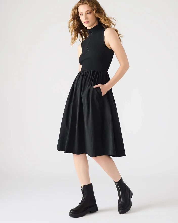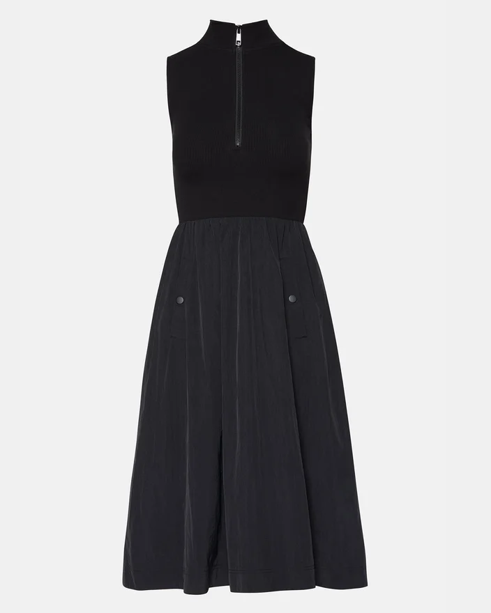 The Berlin Dress is a Versatile and Chic Addition to Any Wardrobe. With a Stylish Combination of a Sleeveless Knit Top and a Nylon A-Line Skirt, This Midi Length Dress is Both Comfortable and Fashionable. Perfect for Spring, It Features a Zip Front, Mock Neck, and Snap Pockets for Added Functionality. Elevate Your Style with This Midi Dress.