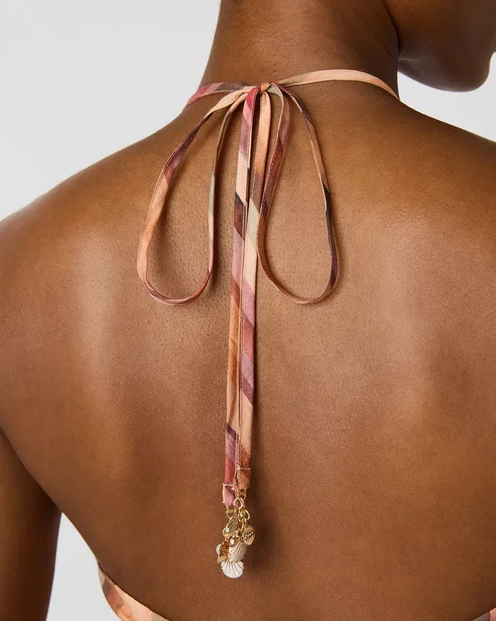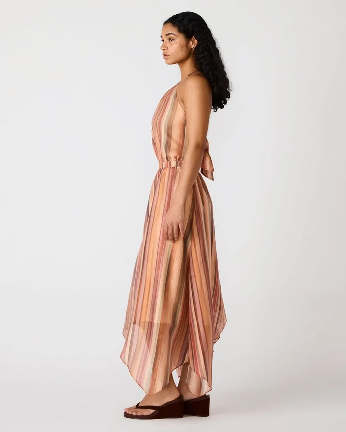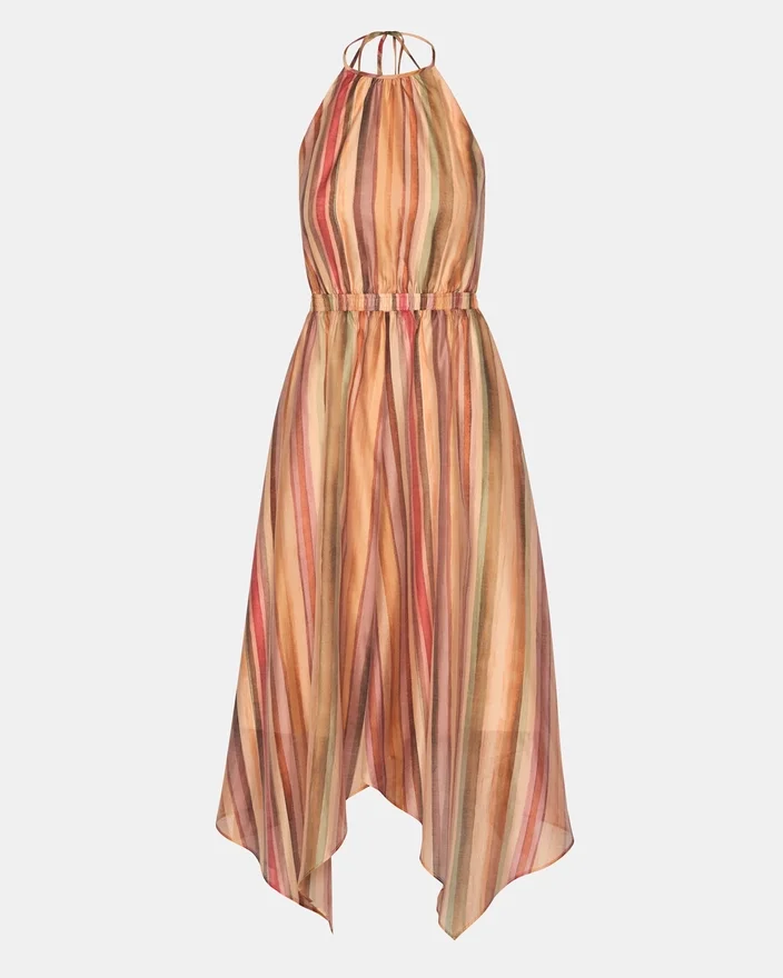 The Dalina Dress Stripe Multi Features a Graceful Halter Neckline That Elegantly Frames the Shoulders While Offering Versatile Styling Options. Vertical Stripe Detailing in a Multi-Color Palette Adds Visual Interest and Movement to the Silhouette. The Flowing Fabric Drapes Beautifully, Creating a Relaxed Yet Refined Aesthetic Perfect for Warm-Weather Occasions. This Piece Transitions Effortlessly from Casual Daytime Wear to Evening Events, Making It a Versatile Addition to Any Wardrobe.