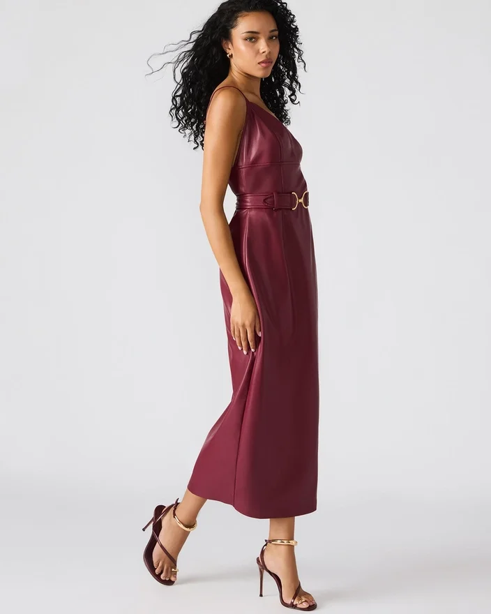 This Kailey Cordovan Faux Leather Midi Dress Features Adjustable Straps for a Customizable Fit and a Back Zipper Closure for Ease of Wear. Its Sleek Finish Offers a Sophisticated, Modern Look Ideal for Both Day and Evening Occasions. The Sleeveless Design Enhances Versatility, Making It a Stylish Choice for Layering or Wearing Solo.