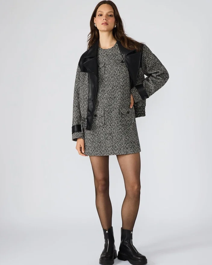 This Sleeveless Mini Dress Features a Classic Tweed Design, Offering a Sophisticated Yet Modern Look. Its Tailored Silhouette is Enhanced by Faux Pockets, Adding Style Without Bulk. Perfect for Elevating Your Wardrobe with a Chic, Versatile Piece That Transitions Seamlessly from Day to Night.