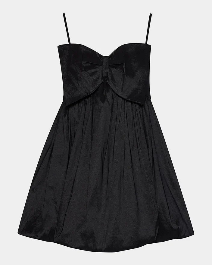 The Topanga Black Mini Bubble Dress Features an Oversized Bow Front and Adjustable Straps for a Customizable Fit. Its Back Smocking Ensures a Comfortable and Effortless Look. Perfect for Any Occasion, This Dress Combines Style and Comfort Seamlessly.