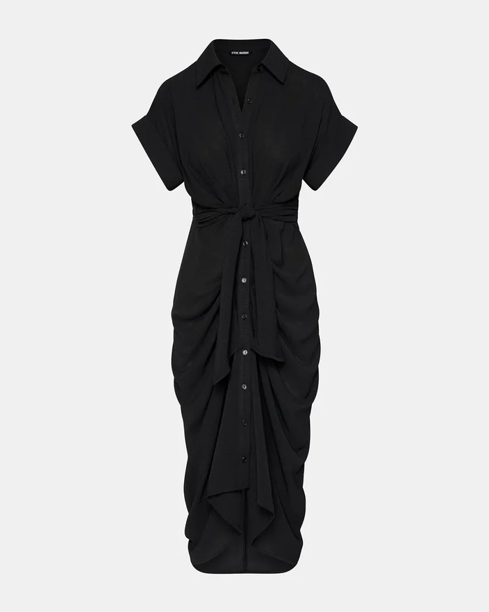 The Tori Dress Has a Rolled Collar and Cuffed Short Sleeves, with an Adjustable Gathered Tie-Front Waist and a High-Low Hem. The Dress is Finished with a Lightweight Woven Crepe Fabric, Giving It a Polished Look.