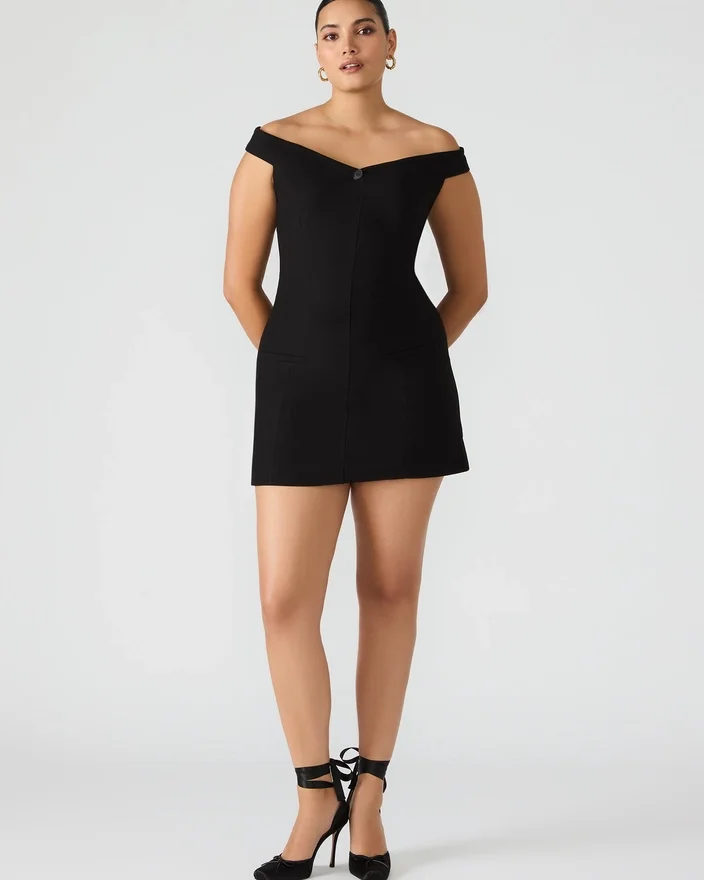 The Yana Dress is a Sophisticated Pleated Mini Dress Designed with an Off-The-Shoulder Neckline That Highlights Elegance. It Features Refined Button Details on the Front and a Back Zipper Closure for a Seamless Fit, Making It a Perfect Choice for Polished, Fashion-Forward Looks.