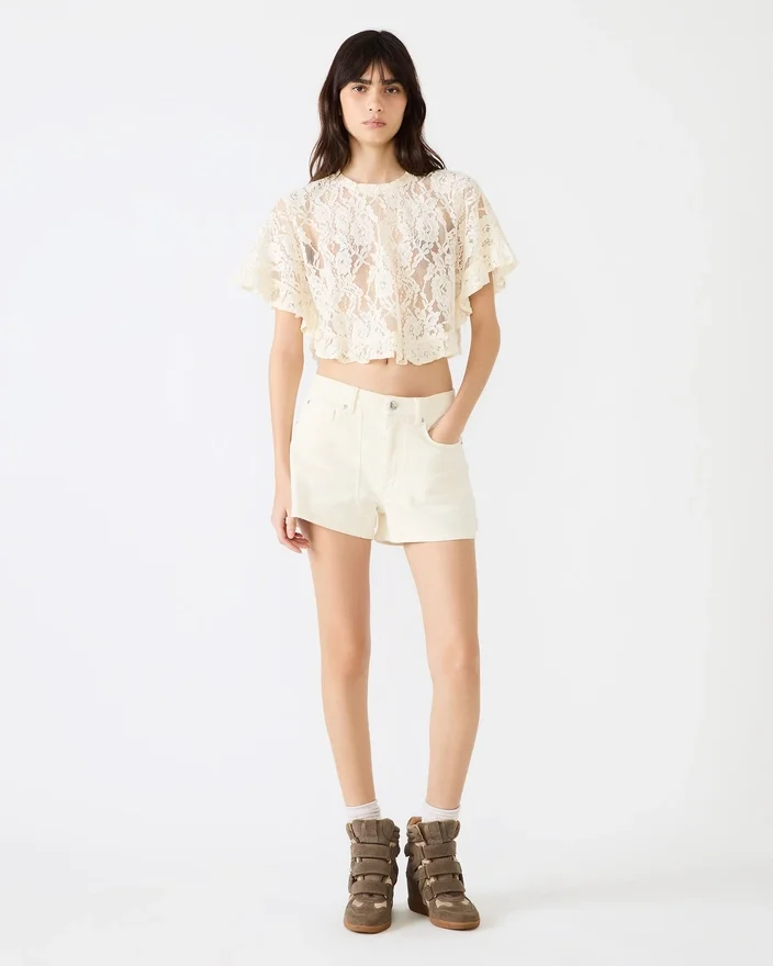 Elevate Your Layering Game with the Callum Top Cream. This Short-Sleeved Cropped Silhouette Features Delicate Lace Detailing and Sheer Mesh Panels That Create an Effortlessly Sophisticated Look. Perfect for Styling over Basics or as a Standalone Piece, the Airy Construction Offers Breathable Comfort While the Cropped Cut Flatters Modern Proportions. A Versatile Essential That Transitions Seamlessly from Day to Evening.