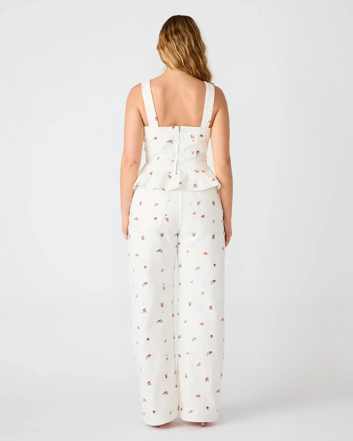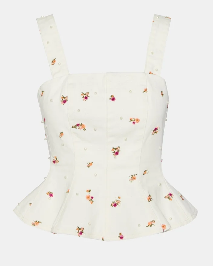The Fiorella Top Antique Combines Contemporary Style with Vintage-Inspired Details. This Denim Sleeveless Top Features a Charming Ruffle-Edged Bottom and Arrives as a Complete Matching Set. Adorned with Vibrant Multi-Colored Floral Embroidery, It Effortlessly Transitions from Casual Daytime Wear to Evening Occasions. The Structured Denim Construction Provides Durability and Shape Retention, While the Thoughtful Design Elements Add Visual Interest and Dimension. Perfect for Layering or Wearing Solo, This Piece Brings an Artisanal Touch to Your Wardrobe.