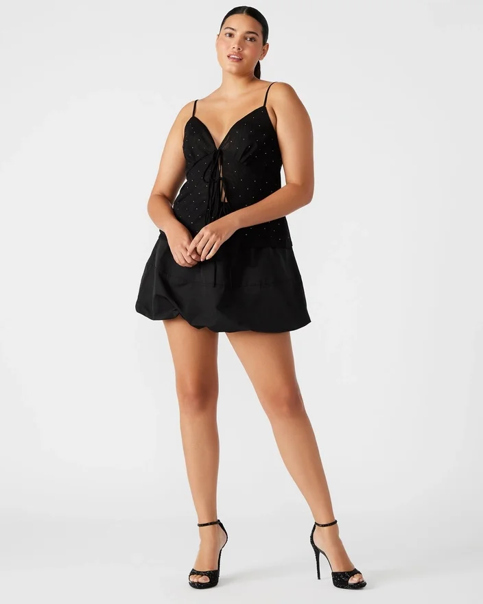 Introducing the Indy Top, a Sleek Camisole Tank with a Stylish Tie-Front Design and Mini Delicate Rhinestone Studs. The Adjustable Straps Provide a Perfect Fit, Making It a Must-Have for Any Fashion-Forward Wardrobe. Elevate Your Look with This Versatile Top.