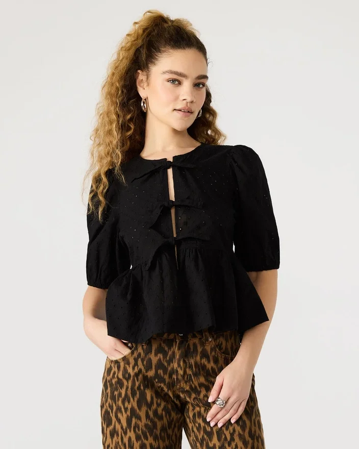 The Paula Top Features Stylish Short-Sleeved Puff Sleeves and a Tie-Front Detail, Accented by Delicate Eyelet Detailing. This Top Offers a Chic, Modern Look Perfect for Any Occasion.