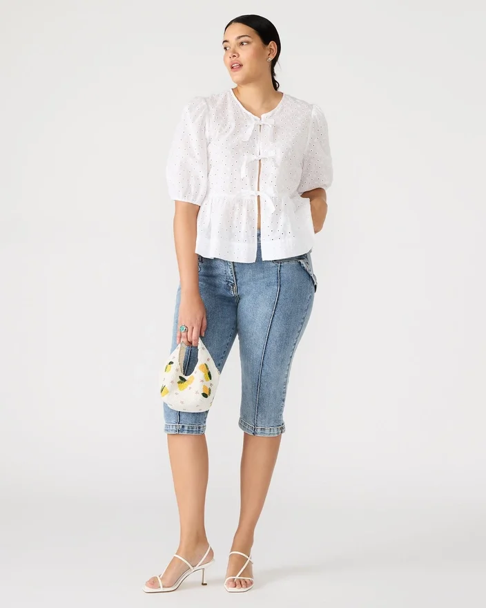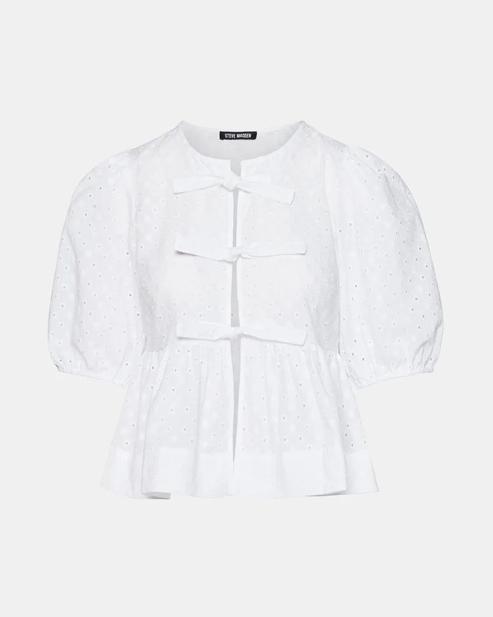 The Paula Top Features Stylish Short-Sleeved Puff Sleeves and a Tie-Front Detail, Accented by Delicate Eyelet Detailing. This Top Offers a Chic, Modern Look Perfect for Any Occasion.