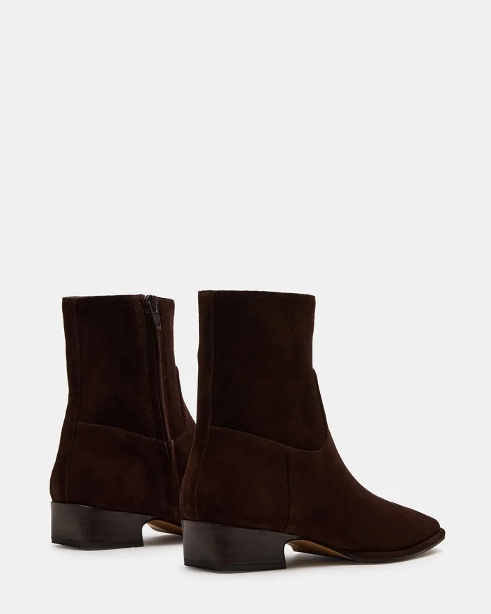 These Define Brown Suede Ankle Boots Feature a Modern Square Toe Design That Blends Contemporary Style with Classic Elegance. Crafted from Quality Materials, They Offer a Refined Texture and Versatile Appeal. The Ankle-Height Silhouette Provides Comfortable Support While Enhancing Your Outfit’s Sophistication. Perfect for Both Casual and Dressy Occasions, These Booties Combine Fashion-Forward Details with Reliable Wearability.