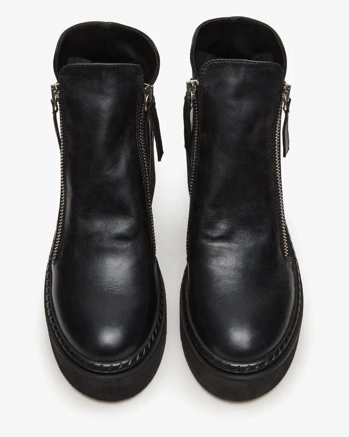 The Drift Ankle Boot Combines Rugged, Moto-Inspired Style with Refined Craftsmanship. Featuring a Distinctive Platform Sole and a Unique Zipper Design, This Bootie Offers Both Bold Aesthetics and Easy Wearability. Crafted from Premium Materials, It Delivers Durability and a Sleek Finish, Making It a Versatile Choice for Elevating Your Footwear Collection with an Expert Edge.