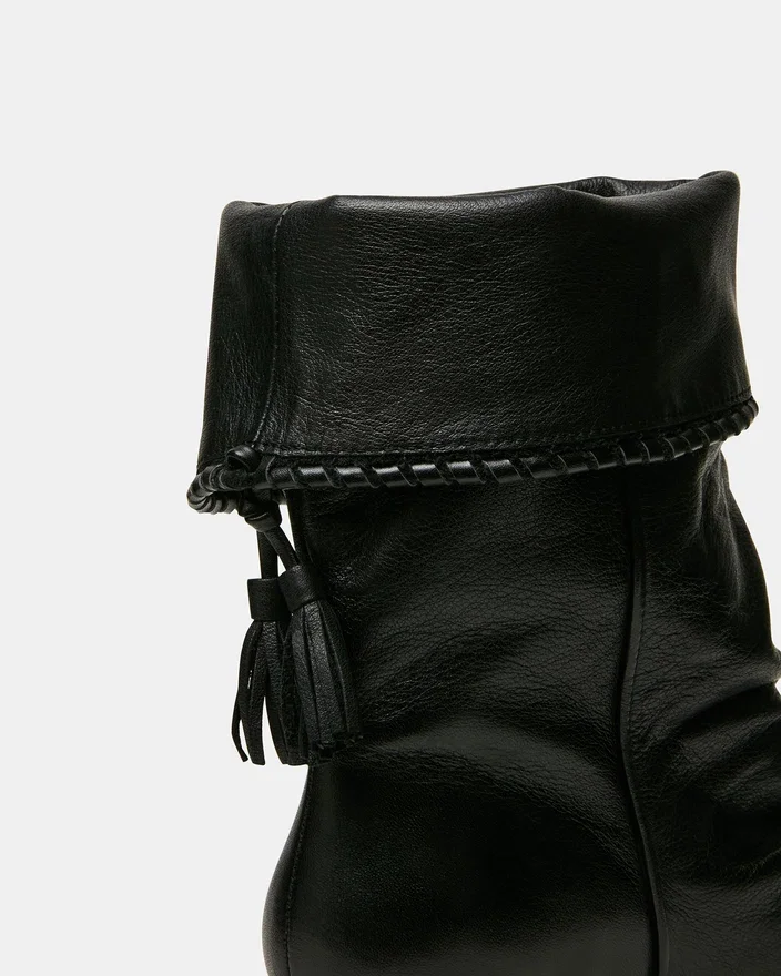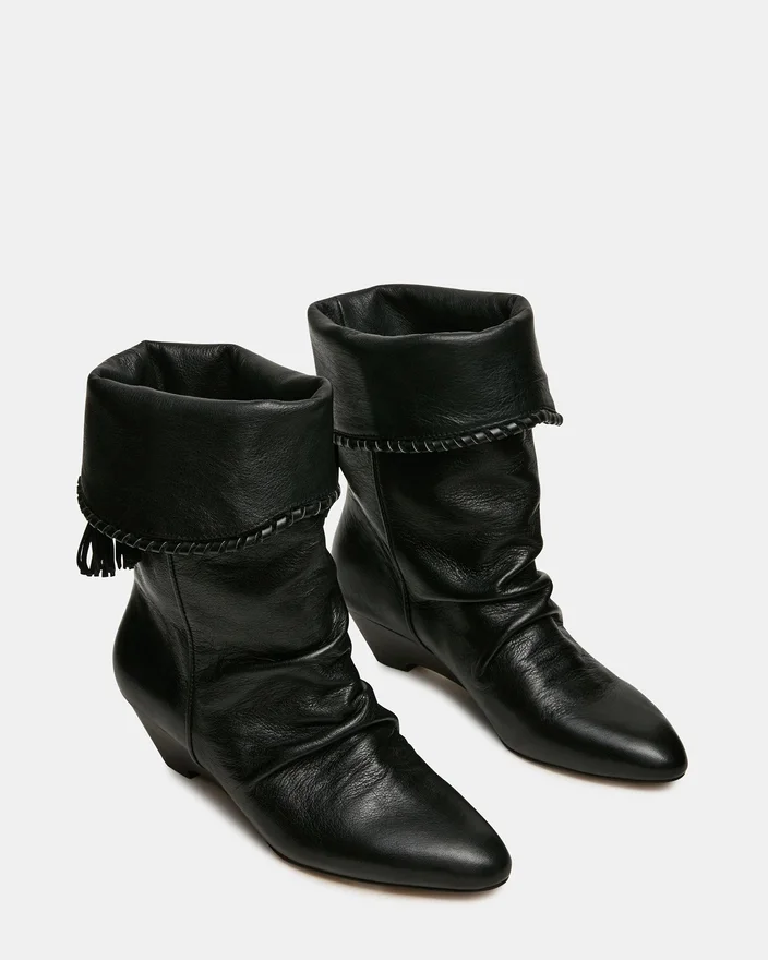 The Enaya Black Leather Wedge Bootie Combines Architectural Sophistication with Refined Details. A Pointed-Toe Silhouette Elongates the Leg, While the Ruched Design Adds Textural Dimension and Visual Interest. The Tassel Accent Provides a Polished Finishing Touch That Elevates Any Ensemble. The Wedge Heel Offers Stability and All-Day Wearability Without Compromising on Style. Perfect for Transitioning from Office to Evening Occasions with Effortless Elegance.