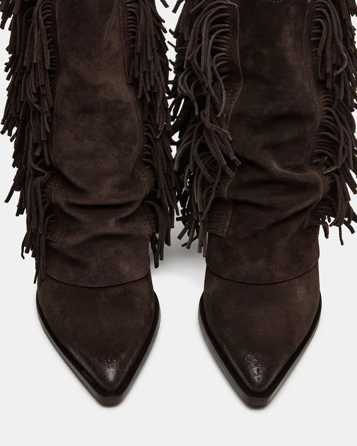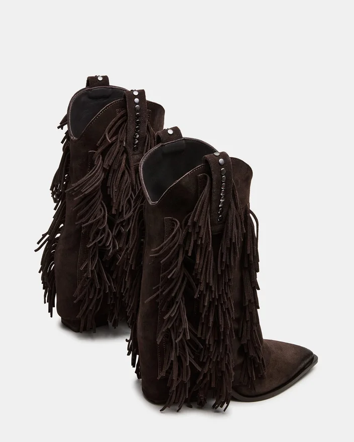 The Landmark Brown Suede Bootie Showcases Expert Craftsmanship with a Bold Western Influence. Featuring Stylish Fringe Accents, Stud Detailing, and a Cuffed Silhouette, These Booties Offer a Distinctive Look. The Pointed Toe Enhances Their Sleek Profile, Making Them an Ideal Choice for Those Seeking a Versatile Blend of Character and Sophistication.