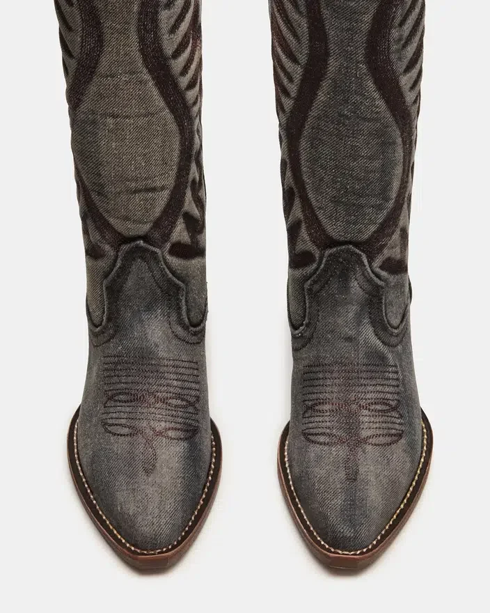 Expertly Crafted, These Albany Black Denim Boots Boast a Pointed-Toe Design and Traditional Western Style. Made from Quality Materials, These Boots Are Both Stylish and Durable. Perfect for Any Occasion, These Boots Will Elevate Any Outfit.