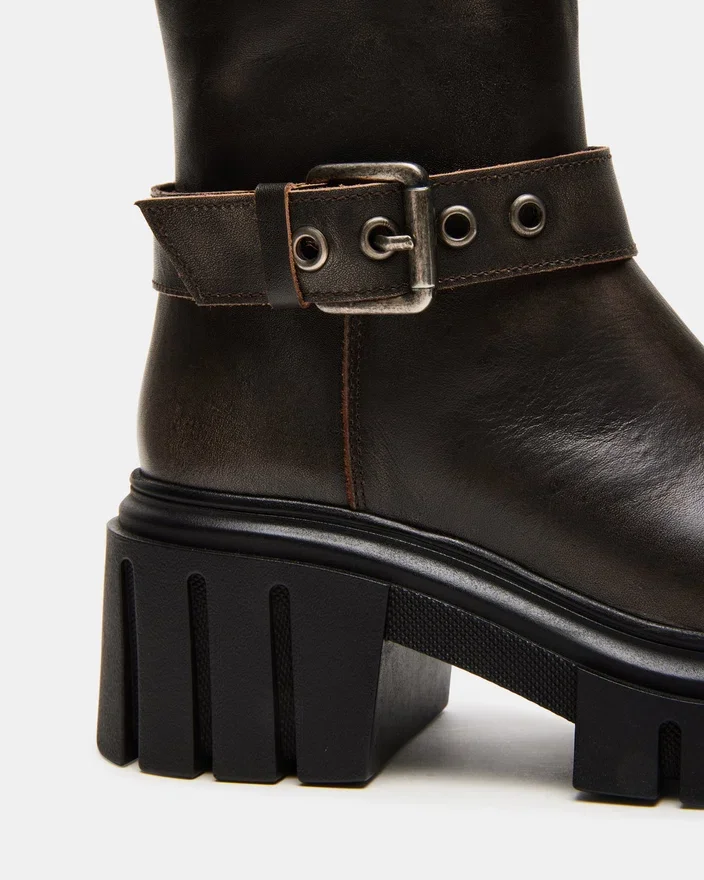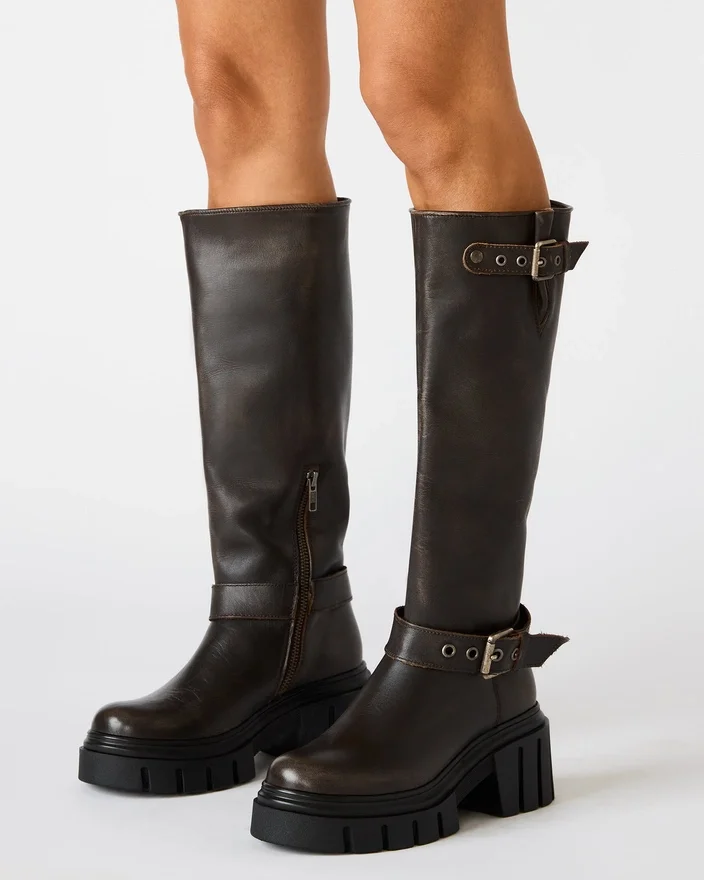 These Brigade Boots Feature a Unique Moto Design and Buckle Details, Making Them a Stylish Choice for Any Outfit. With a Lug Knee-High Fit, These Boots Provide Both Fashion and Function. The Perfect Addition to Any Wardrobe for a Trendy, Edgy Look.