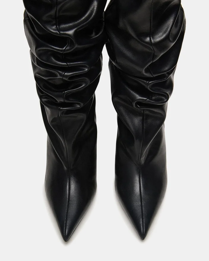 The Distortion Boot Features a Scrunched Design, Wedge Heel, and a Pointed-Toe, Extending to Knee Height for a Bold, Fashion-Forward Silhouette. Crafted to Combine Edgy Style with Comfortable Wear, This Boot Elevates Any Outfit with Its Sleek Design and Distinctive Wedge Support. Ideal for Those Seeking a Statement Piece That Balances Trend and Practicality.
