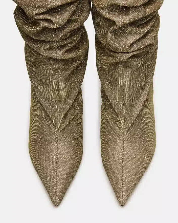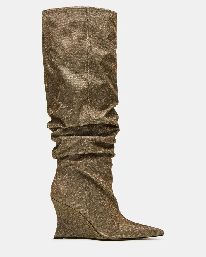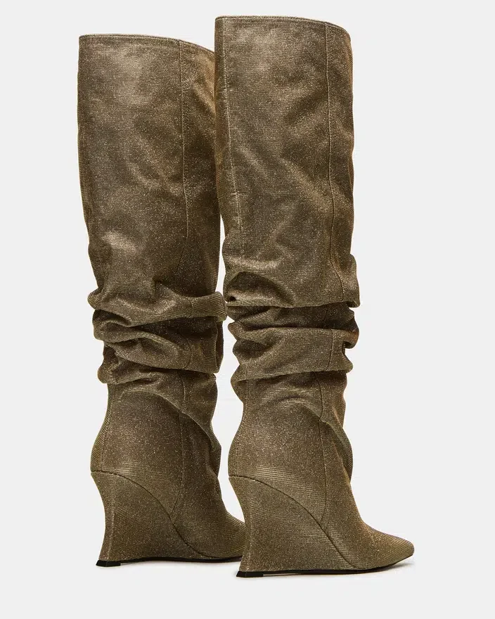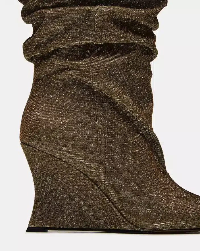 The Distortion Gold Glitter Boot Features a Scrunched Design, Wedge Heel, and a Pointed-Toe, Extending to Knee Height for a Bold, Fashion-Forward Silhouette. Crafted to Combine Edgy Style with Comfortable Wear, This Boot Elevates Any Outfit with Its Sleek Design and Distinctive Wedge Support. Ideal for Those Seeking a Statement Piece That Balances Trend and Practicality.