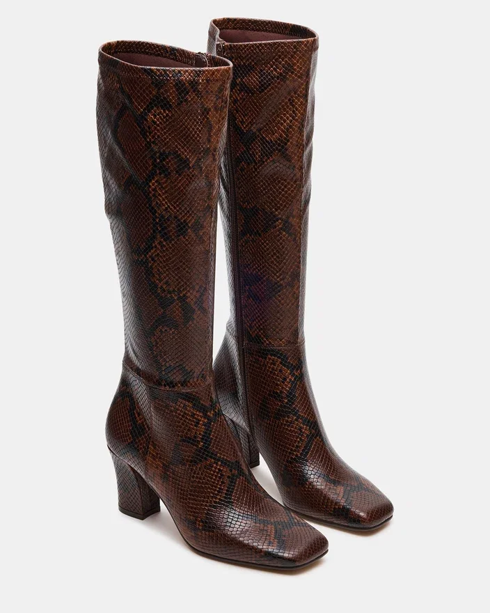 Elevate Your Footwear Collection with the Elliot Brown Snake, a Sleek Square-Toe Knee-High Boot Designed for Both Style and Stability. Featuring a Sturdy Block Heel, This Boot Offers Confident Support and a Modern Silhouette. Its Tall Shaft Provides Versatile Coverage That Pairs Effortlessly with Various Outfits, Making It a Sophisticated Choice for Any Occasion.