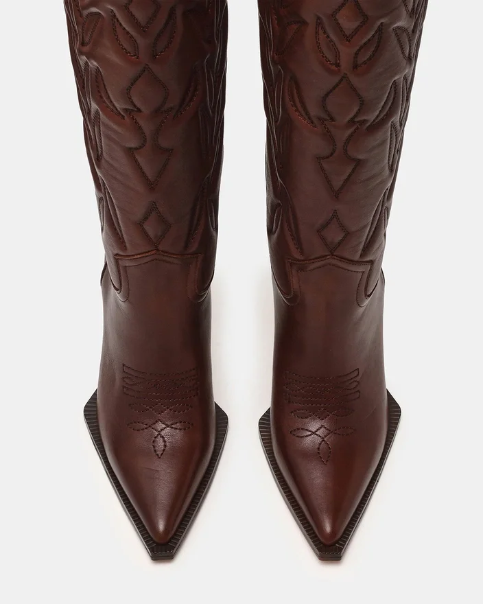 The Kinzee Brown Leather Delivers Western Style with a Modern Edge. This Knee-High Boot Features a Sharp Pointed Toe and Commanding Stiletto Heel That Elongates the Leg. Crafted from Premium Materials, This Style Offers a Sleek Silhouette That Pairs Effortlessly with Everything from Denim to Dresses for a Statement-Making Finish.