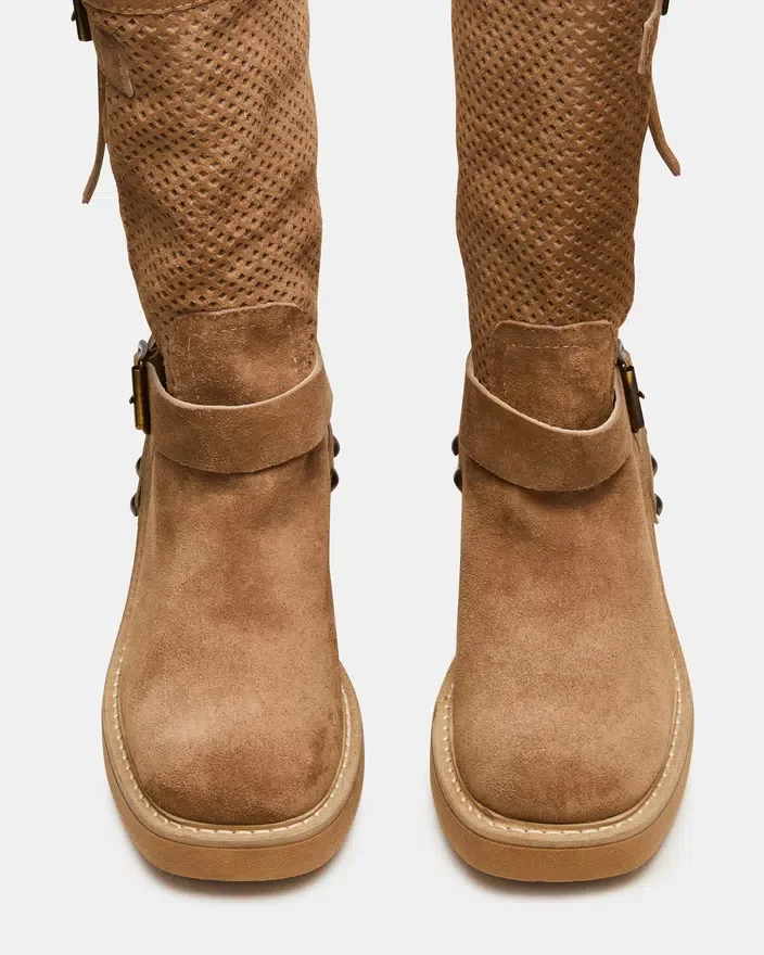 The Lark Chestnut Suede Boot Makes a Statement Through Deliberate Design. A Geometric Square-Toe Paired with a Stable Block Heel Creates a Foundation of Understated Power, While Studded Embellishments Add Contemporary Edge. Buckle Hardware Serves Dual Purpose—Anchoring the Aesthetic While Offering Practical Adjustability. This is Footwear for Those Who Understand True Style.