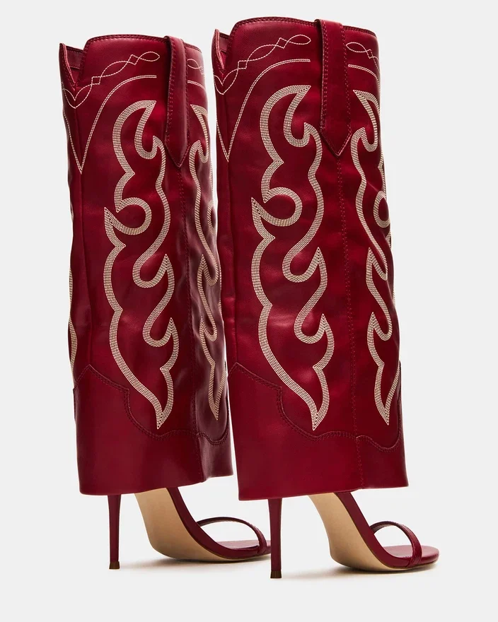 Expertly Crafted and Designed, the Ravine Western Red Cuffed Knee-High Boot Features an Open Toe and Stiletto Heel for a Stylish Touch. The Rounded Toe Provides Comfort While the Sleek Design Adds a Touch of Sophistication. Elevate Your Look with This Must-Have Boot.
