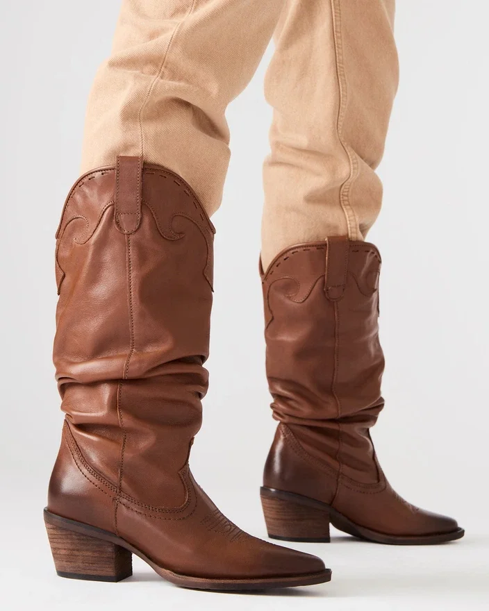 The Stage Boot Combines a Sleek Pointed Toe with a Distinctive Scrunched Design, Drawing Inspiration from Classic Western Styles. Crafted for Both Style and Comfort, This Boot Offers a Refined Silhouette That Elevates Any Outfit with a Touch of Rugged Sophistication. Ideal for Those Seeking a Modern Take on Western Footwear, It Balances Bold Aesthetics with Everyday Wearability.