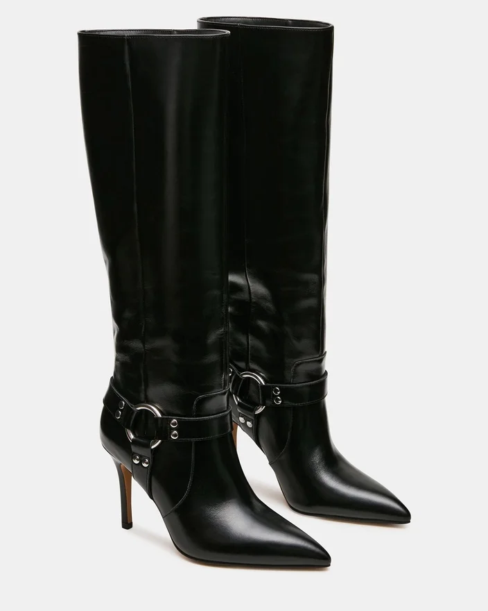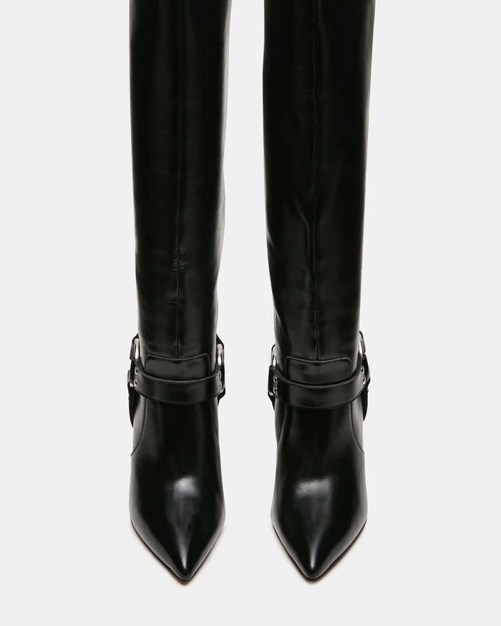 The Talis Black Leather is a Knee-High Boot Featuring a Sleek Pointed Toe and Metallic Accents. This Sophisticated Silhouette Combines Timeless Style with Modern Edge, Making It a Versatile Addition to Any Wardrobe. The Luxurious Construction Pairs Seamlessly with the Refined Hardware for an Elevated Look That Transitions Effortlessly from Day to Night.