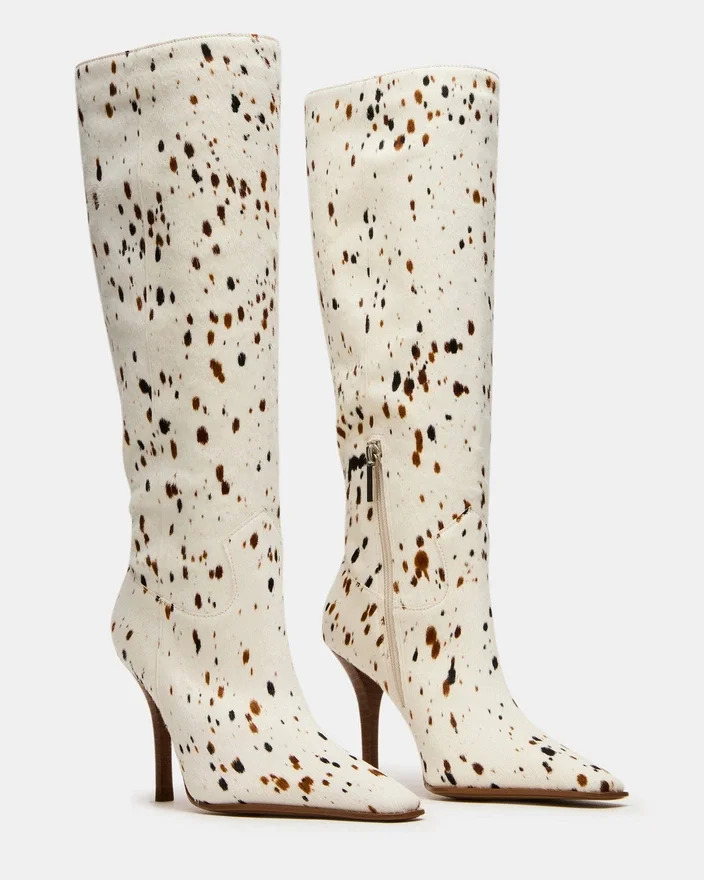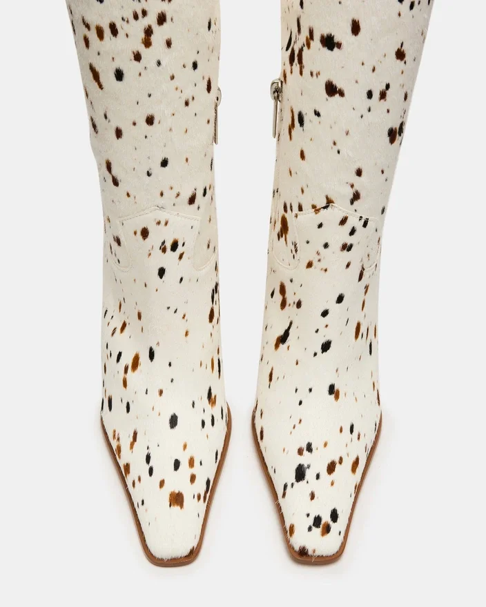Elevate Your Footwear Collection with the Wescot Brown Cow Print Knee-High Boot, Featuring a Modern Square-Toe and a Refined Heel. Crafted from Quality Materials, This Boot Offers Both Style and Structure, Perfect for Sophisticated Looks That Demand Comfort and Confidence. Its Knee-High Silhouette Provides Versatile Wearability, Seamlessly Pairing with Dresses or Tailored Pants for a Polished Finish.
