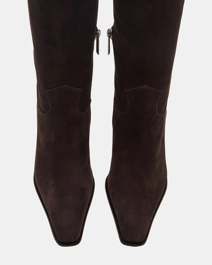 Elevate Your Footwear Collection with the Wescot Brown Suede Knee-High Boot, Featuring a Modern Square-Toe and a Refined Heel. Crafted from Quality Materials, This Boot Offers Both Style and Structure, Perfect for Sophisticated Looks That Demand Comfort and Confidence. Its Knee-High Silhouette Provides Versatile Wearability, Seamlessly Pairing with Dresses or Tailored Pants for a Polished Finish.