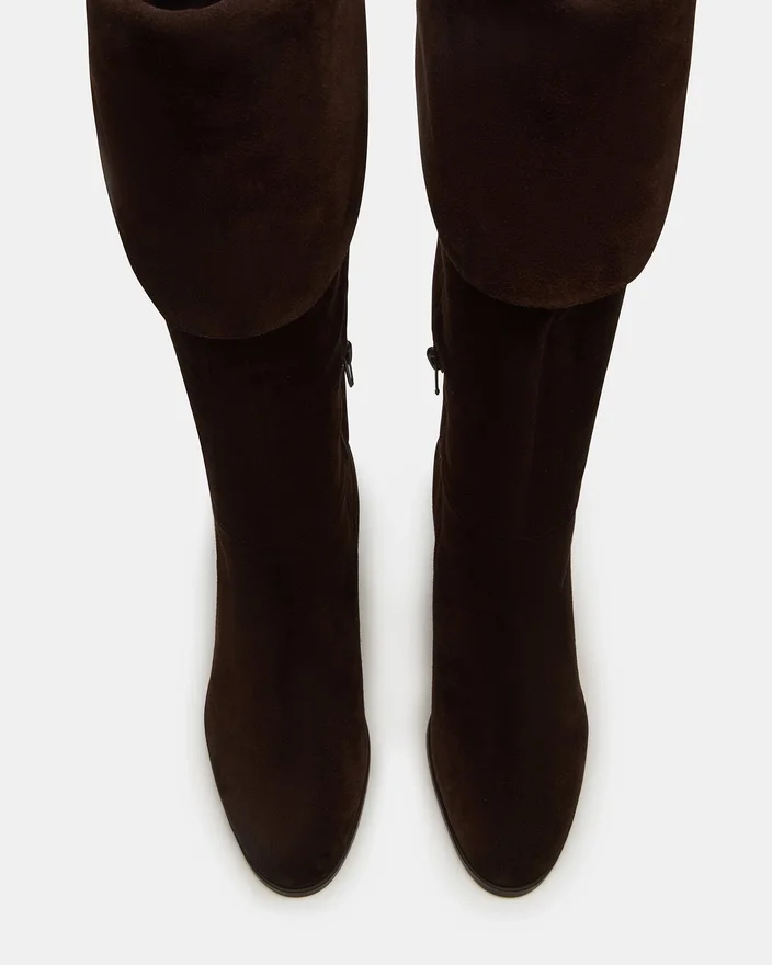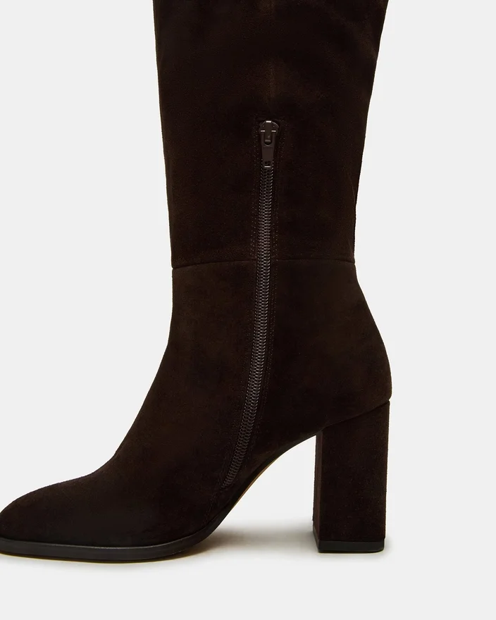 The Winslet Brown Suede Boot Features a Knee-High Silhouette with a Sturdy Block Heel, Offering Both Style and Stability. Its Rounded Toe Design Ensures Comfort for Extended Wear, Making It a Versatile Choice for Elevating Your Wardrobe with a Refined, Expert Touch. This Boot Combines Timeless Elegance with Practical Functionality.