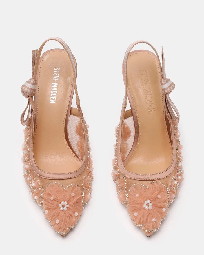 A Grosgrain Ribbon Wraps Around the Slingback Strap of the Bri Mesh Blush Point Toe Stiletto Pump and Finishes with a Bow Accenting the Side of the Shoe.