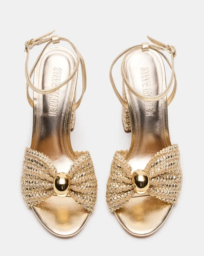 The Cheyla Gold Sandal Features a Stylish Raffia Heel Paired with a Sturdy Block Heel for All-Day Comfort. Complete with a Secure Ankle Strap, This Sandal Offers Both Fashion and Function. Elevate Your Summer Wardrobe with This Versatile and Chic Shoe.