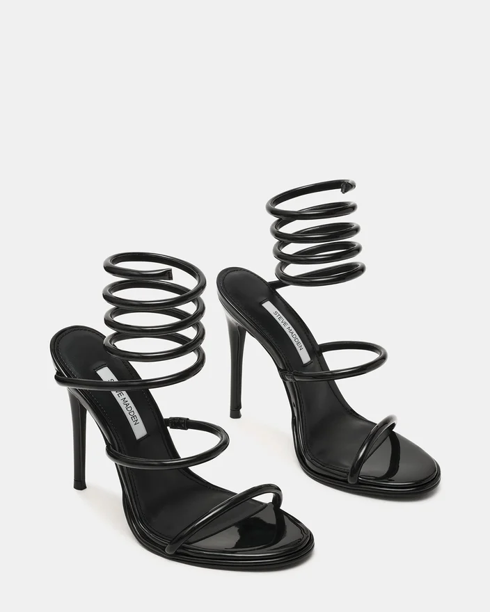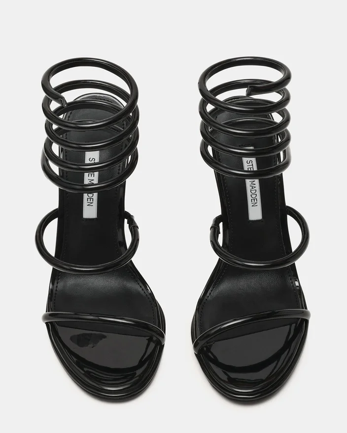 Add a Touch of Luxury to Your Wardrobe with Exotica Black Patent. This Stiletto Sandal with a Strappy Wrap Around the Leg Provides a Unique Look and Feel That Stands out in Any Crowd.