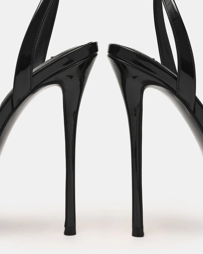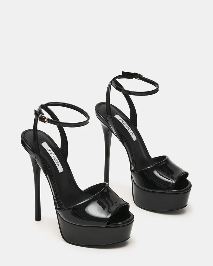 The Jezzica Black Patent Combines a Striking Stiletto Heel with a Secure Ankle Strap for Refined Elegance and Stability. This Platform Heel Creates a Polished, Statement-Making Look. Perfect for Occasions Demanding Sophisticated Style and Confident Presence.