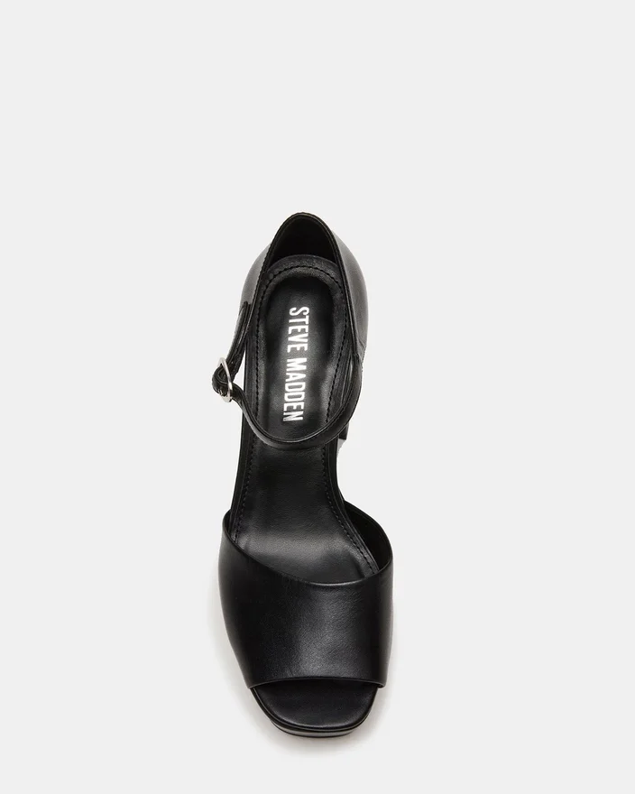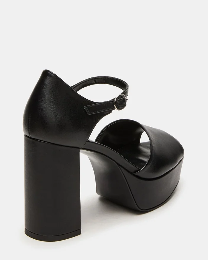 The London Black Leather Features a Sturdy Platform Paired with a Block Heel for Enhanced Stability and Comfort. Its Secure Ankle Strap Ensures a Confident Fit, Making These Heels a Sophisticated Choice for All-Day Wear. Crafted with Attention to Detail, They Combine Style and Practicality Seamlessly.