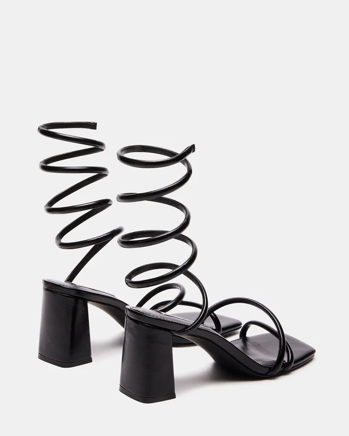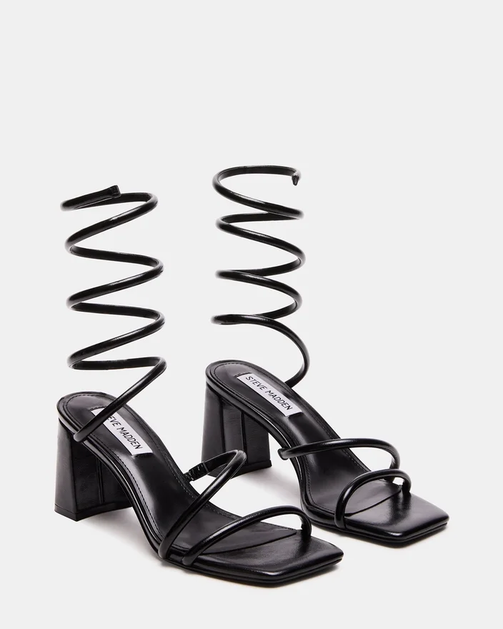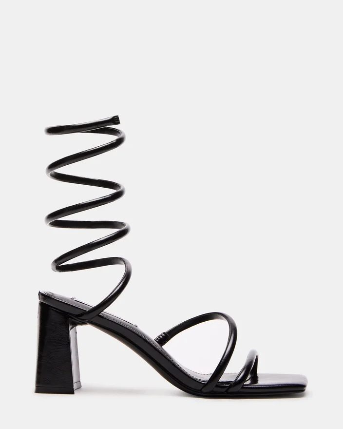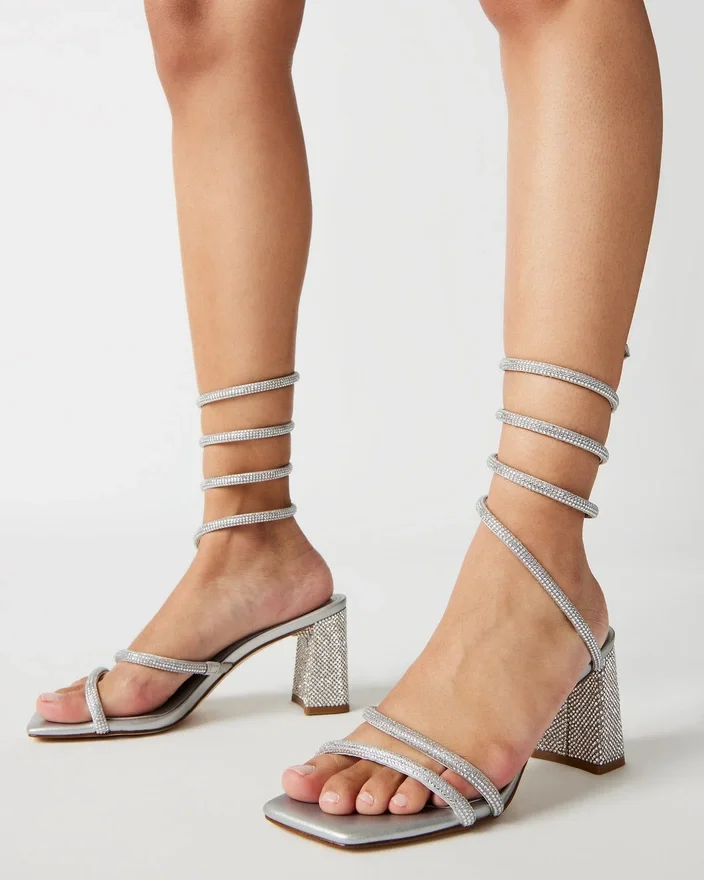 Dimensional Tubular Straps Crossed over the Foot and Coiled Around the Ankle Secure the Lopez Sandal to a Square Toe Sole with a Block Heel.