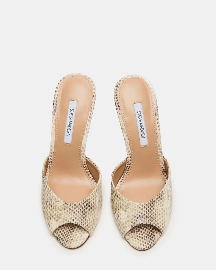 The Priya Natural Snake Sandal Pairs a Slender Stiletto Heel with a Retro-Inspired Peep Toe Design on the Slide Strap at the Front.